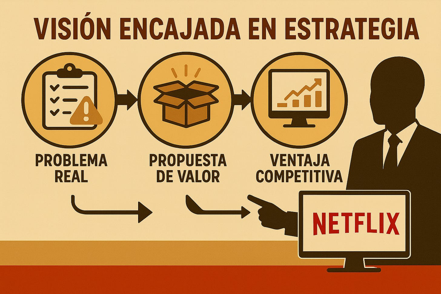 La visión de Netflix estaba bien fundamentada porque se alineaba con varias piezas de su estrategia. Encajaba con un problema real: alquilar era incómodo. Encajaba con la propuesta de valor: ofrecer algo mucho más simple y sin penalidades. Y encajaba con su ventaja competitiva: usar internet y datos para ofrecer una experiencia que las tiendas físicas no podían dar.