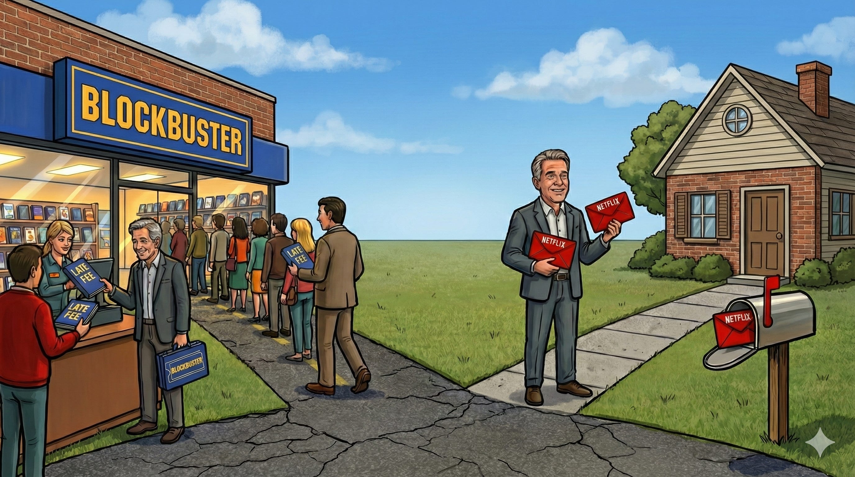A finales de los años 90, Reed Hastings, cofundador de Netflix, acumuló 40 dólares en multas por devolver tarde una película de Blockbuster —por aquel entonces la cadena líder de alquiler de películas en tiendas físicas. Aquella experiencia le hizo cuestionar por qué el modelo de alquiler funcionaba como una biblioteca que castigaba al usuario con multas, en lugar de ofrecer algo más flexible.